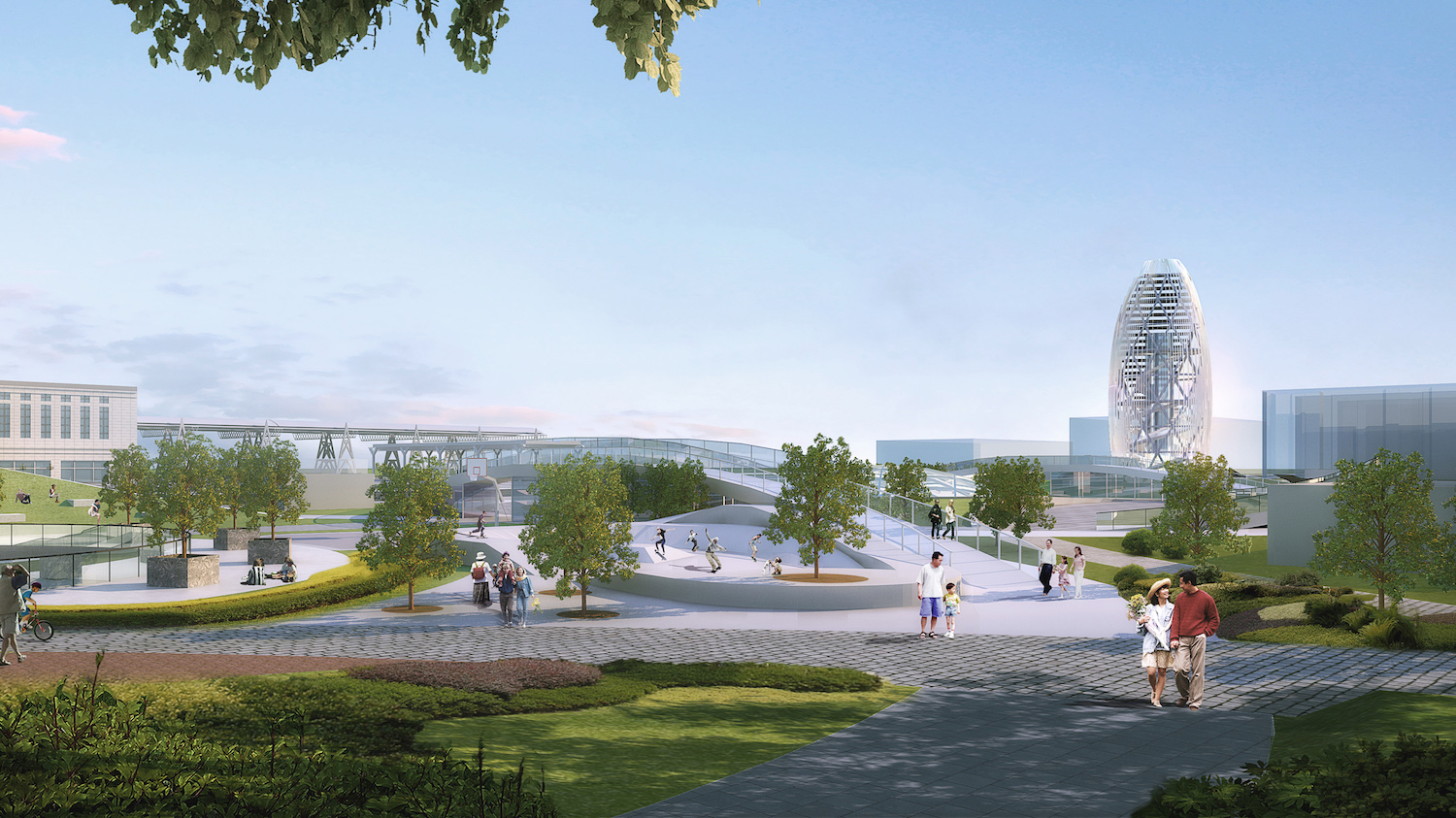 地上の公園広場は、動線となる連続した三つのリングを配置し、起伏や高低差を設けることでエリアを分割、ジョギング、サイクリングコース、スケートボードパーク、屋外ステージ、健康広場などを計画した。リングの交差部からは、地下へ自然採光が取れるようにし、一部は地面をめくりあげ、地下への出入口をつくった。公園を散策しながら連続的に地下商業空間へと誘う工夫がされている。